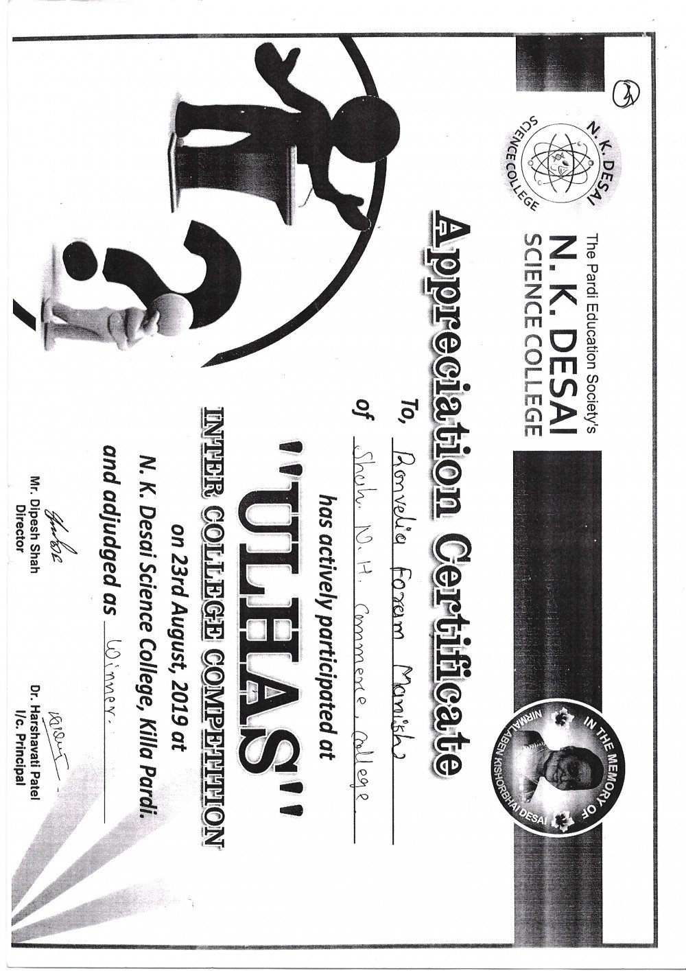 2 students participated in Inter College Elocution Competition at Science College, Pardi where 1 student won the 3rd prize.