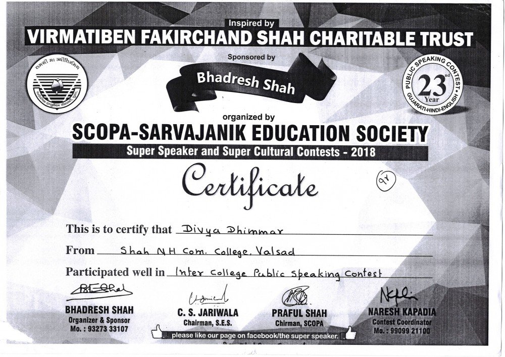 “The Supar Speaker Contest-2018” was organized by Veermati Fakirchand Shah Charitable Trust, Surat. Miss Divya Dhimmar stood second Miss.Shivani Gupta stood third and Miss Mamta Rajpurohit got consolation prize in an Elocution competition.