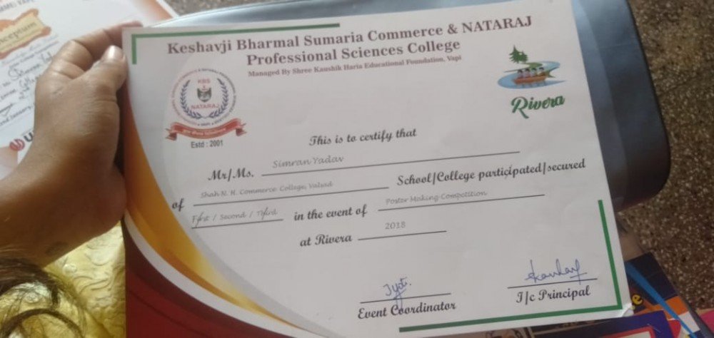 Miss Simran Yadav participated in a Poster Making competition organized at Keshavji Bharmal Sumaria commerce &Nataraj professional sciences college, vapi and stood Second.