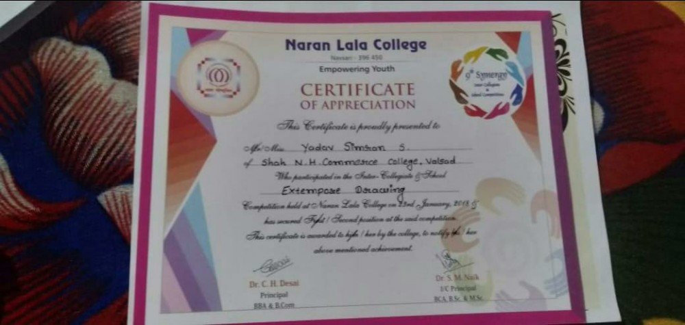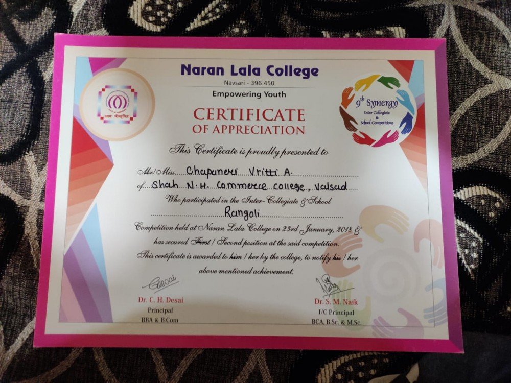 Miss Vruti champaneri participated in a Rangoli Competition organised at Naranlal Commerce College Navsari and stood second.