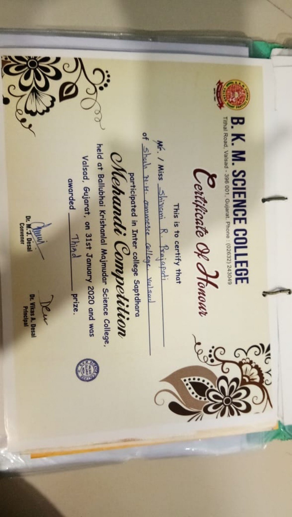 Miss Shivani Prajapati participated in a Mehandi competition organised B.K.M. Science college, Valsad and stood Third.
