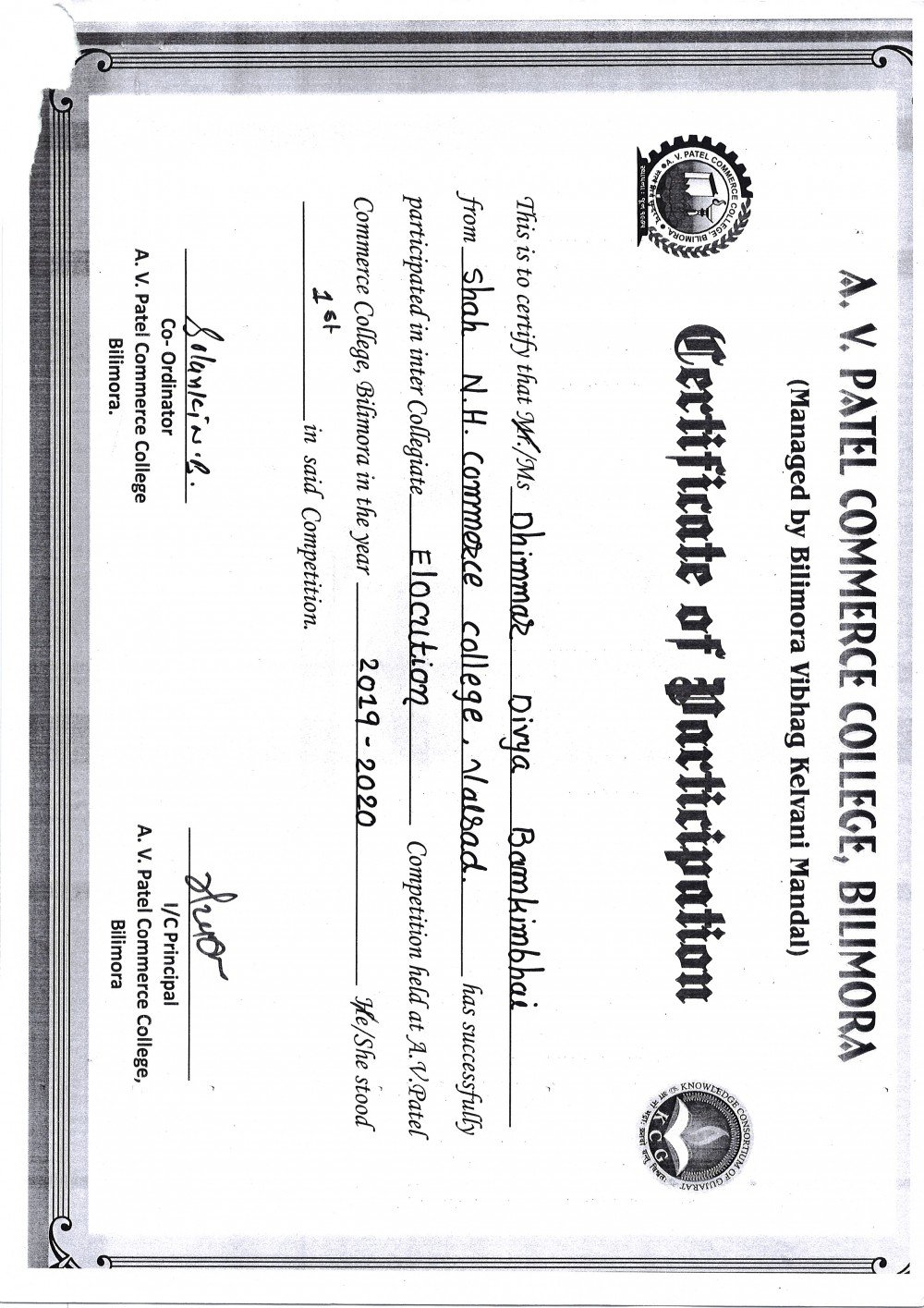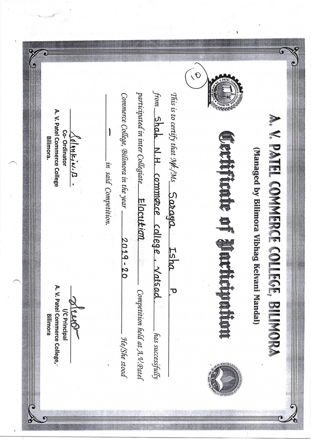 2 students took part in Inter College Elocution Competition held at A.V. Patel Commerce College, Bilimora and 1 student won 1st prize.