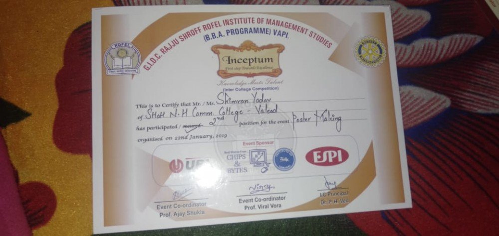 Miss Simran Yadav participated in a poster Making Competition organized at G.I.D.C. Rajju Shroff Rofel Institution of Management Studies, Vapi and stood Second.