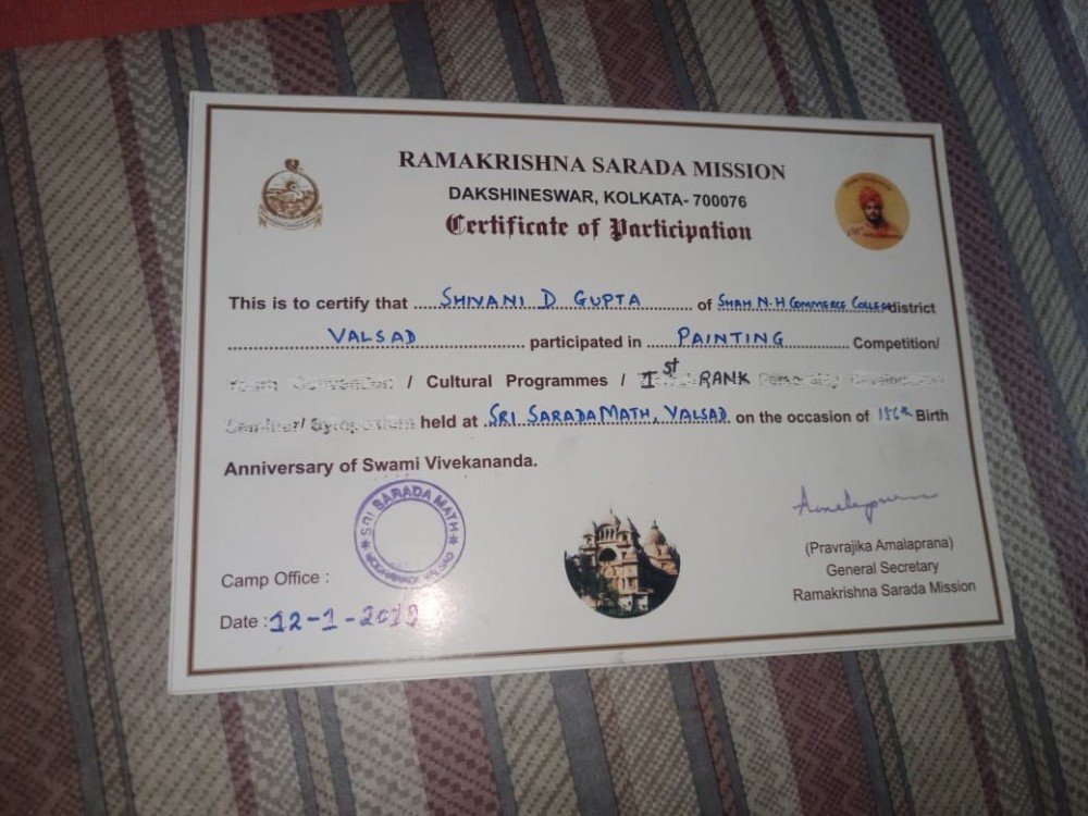 Miss Shivani Gupta participated in a painting competition organized at Ramakrishna Sarda Mission, Valsad and stood First.