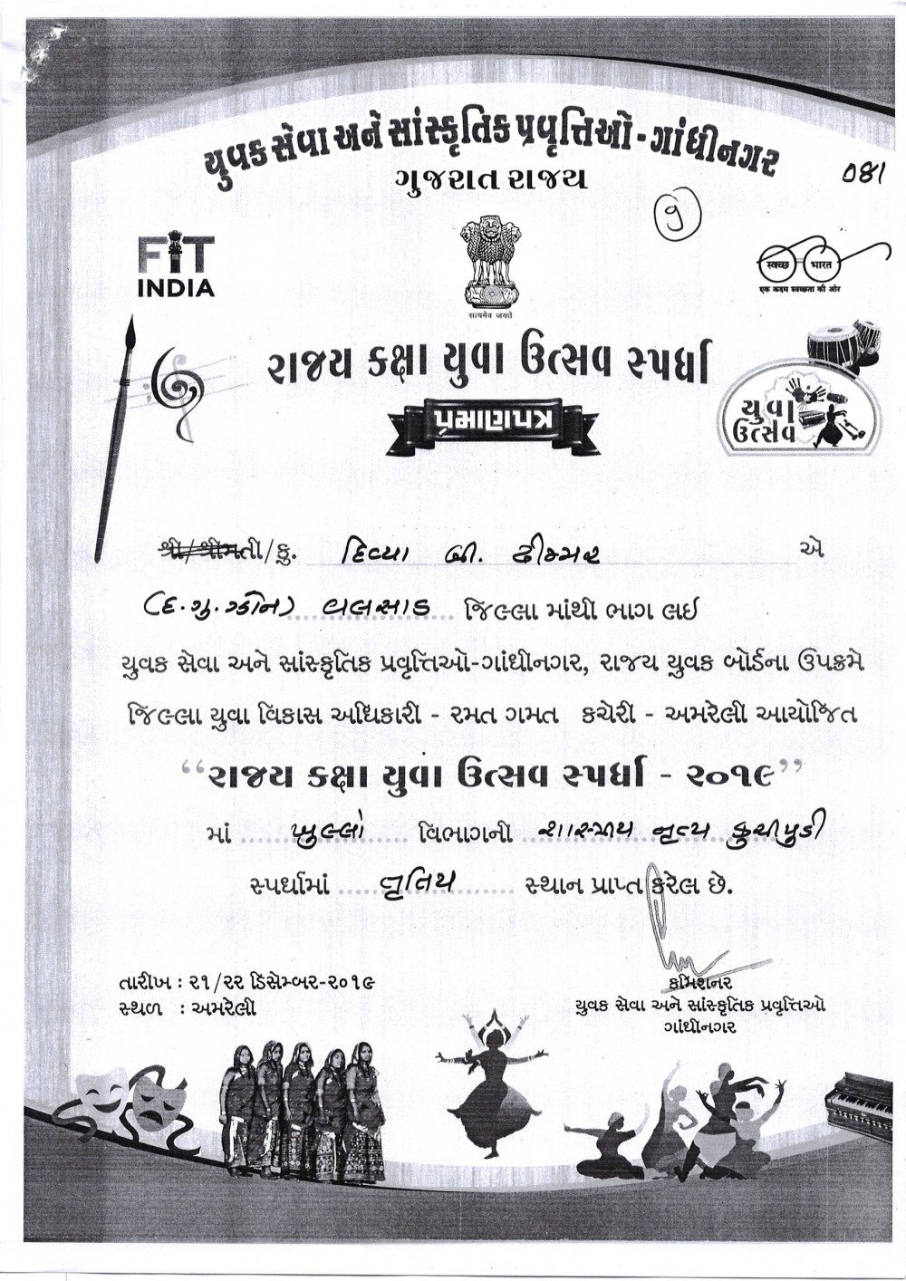 Ku. Divya Dhimmar took part in State Level Youth Festival held at Amroli.