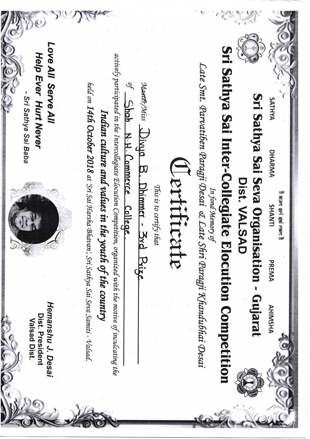 Elocation competition organized by Shree Satya Sai Seva Mandal, Valsad.